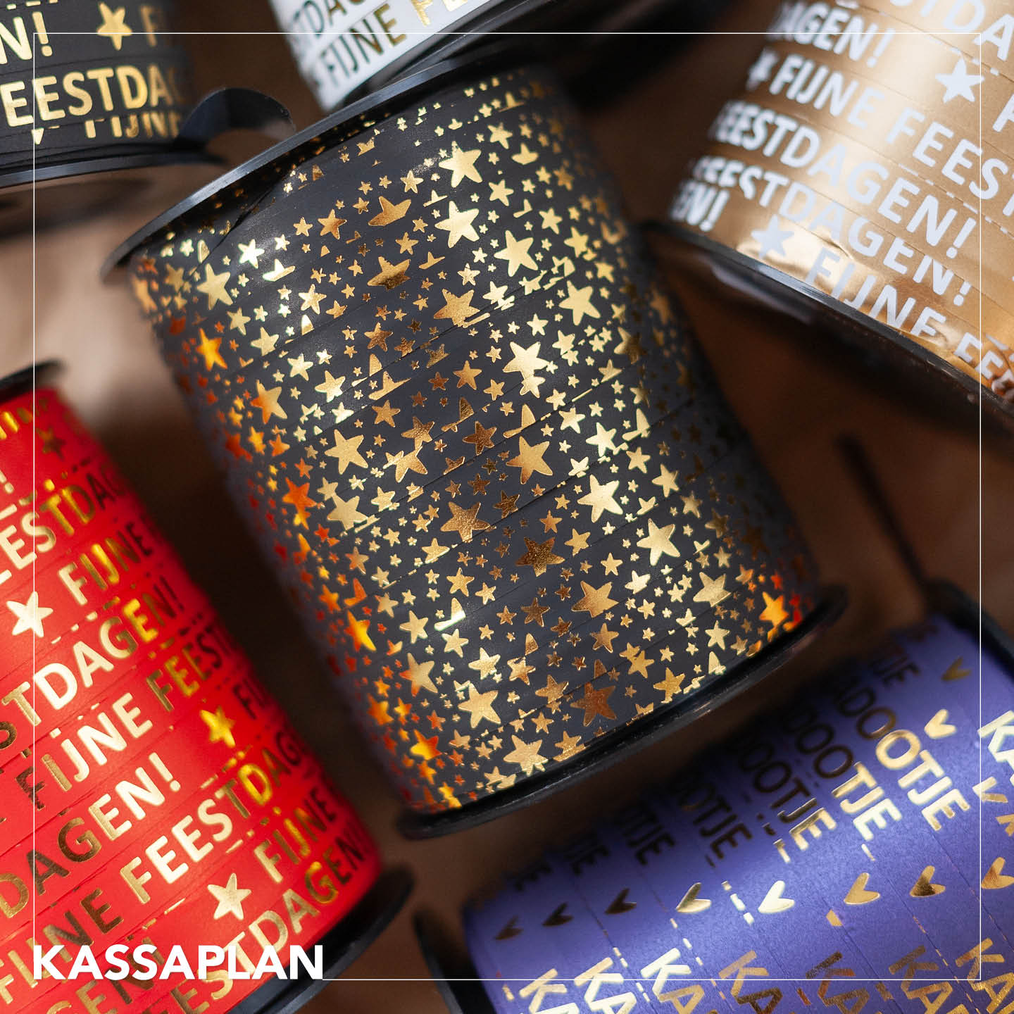 KP® Bedrukt cadeaulint - Stars 10mmx150m, Zwart/Goud