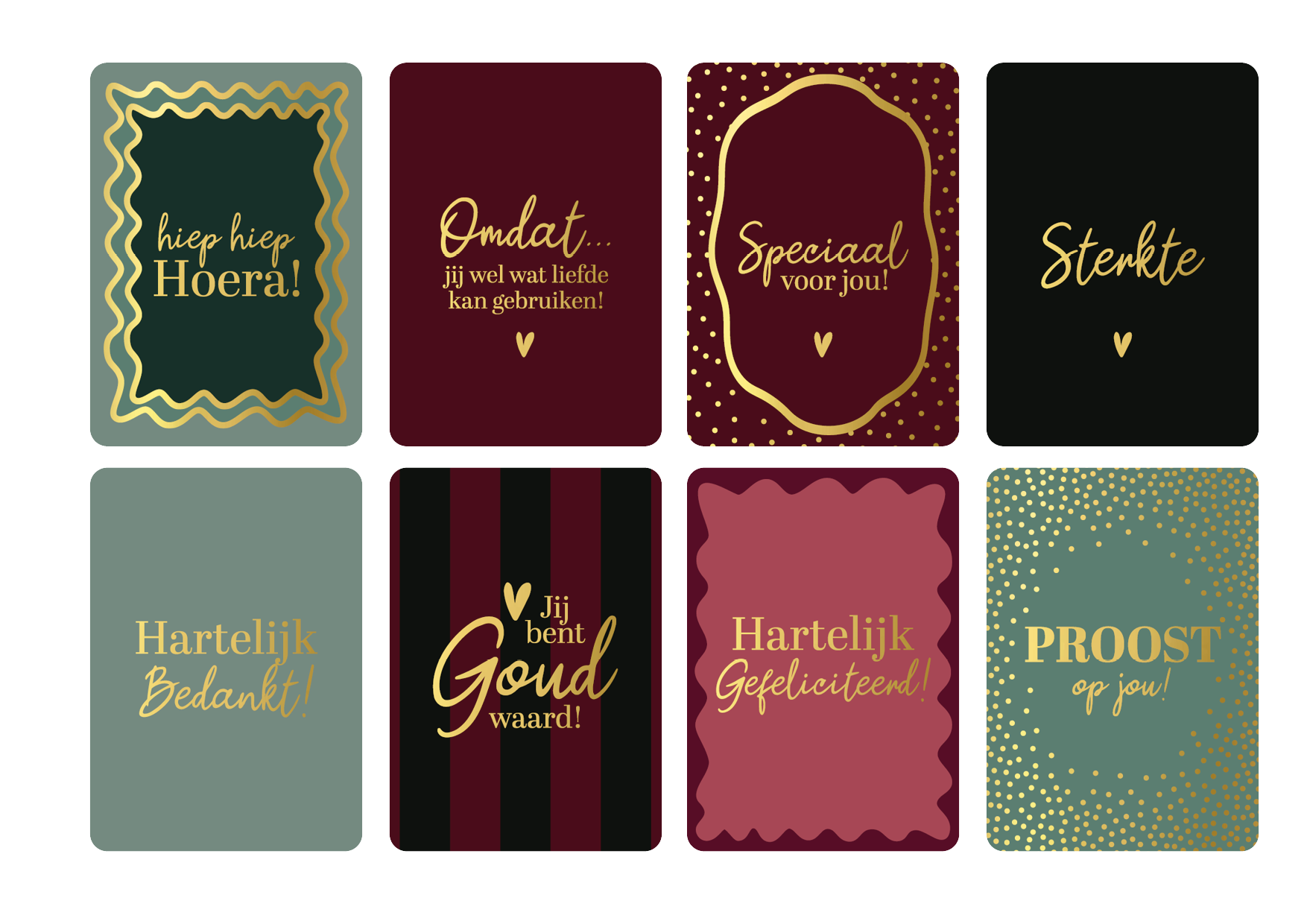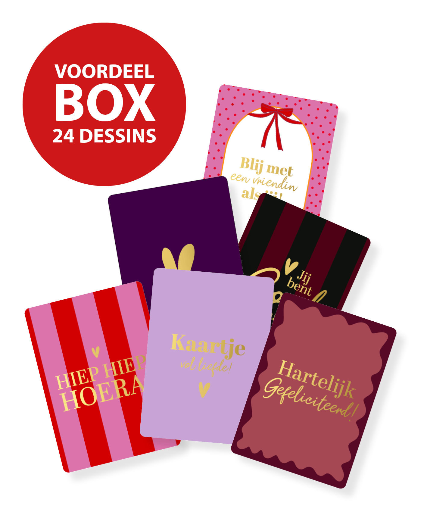 In dit pakket met 24 verschillende dessins ontvangt u van elk dessin 25 kaarten. De volgende cadeaukaartjes zitten in dit pakket: