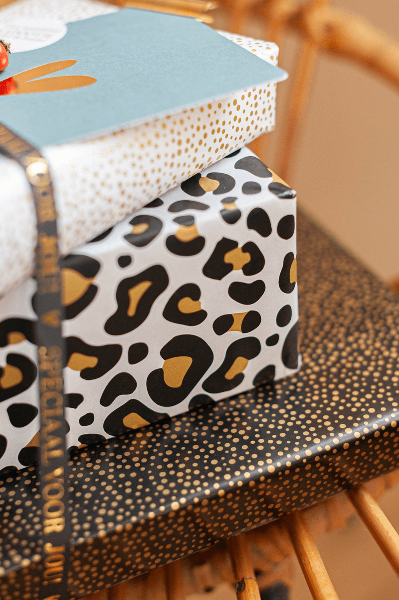 Coated cadeaupapier Leopard white/gold 30cm 100 meter. Perfect te gebruiken voor het inpakken van uw cadeautjes of geschenk.