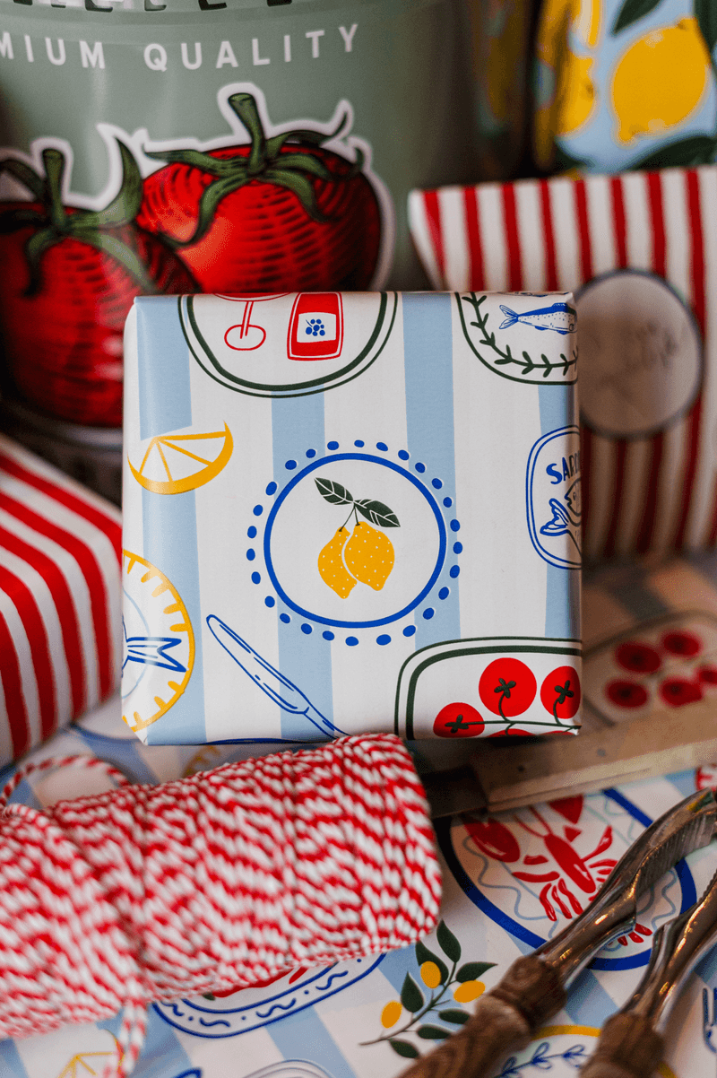 Coated cadeaupapier Seaside Supper op rol van 100 meter met een stijlvol en eigentijds dessin. Perfect te gebruiken voor het inpakken van je cadeautjes of geschenk.