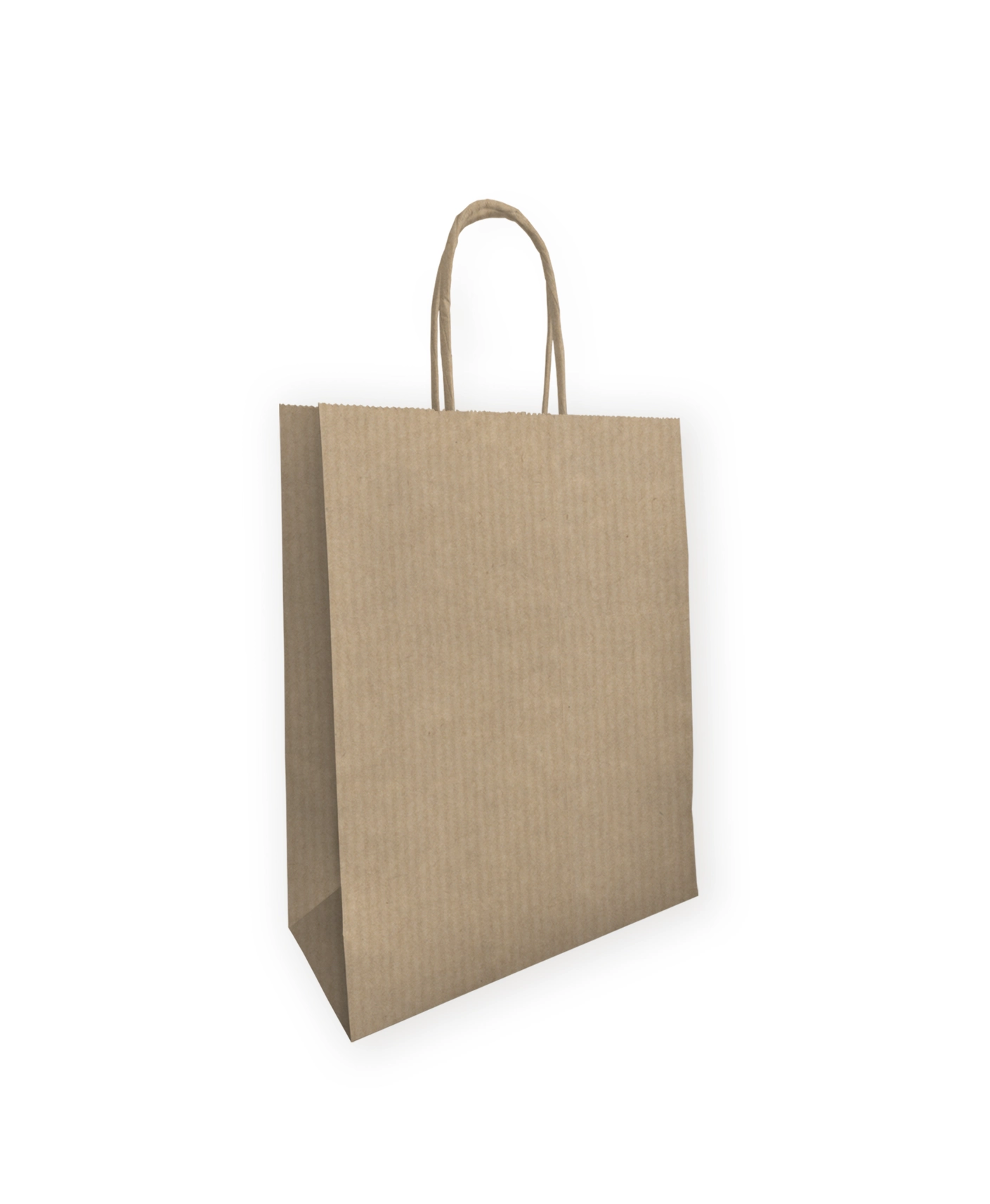 Standaard model ribbed kraft papieren tas klein voorzien van luxe gedraaide handgrepen in dezelfde kleur. Deze tasjes worden veel gekozen door winkels voor het meegeven van kleding, woonaccessoires, beauty producten, boekjes en andere kleine artikelen.