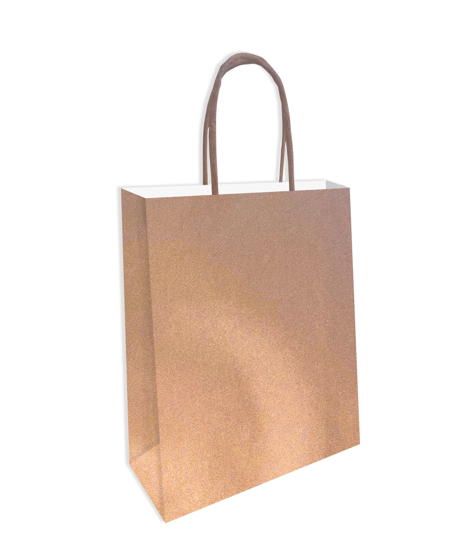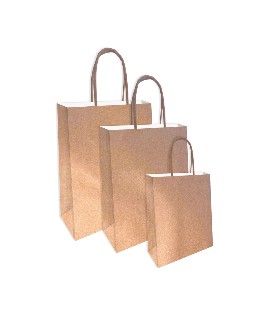 Deze tassen zijn gemaakt van wit of bruin kraftpapier. Bij de bruine en witte tassen hebben de tassen aan de buitenkant en de binnenkant dezelfde kleur. Bij de witte tassen wordt de buitenkant bedrukt met een kleur zoals zwart. Hierdoor is de buitenkant zwart en de binnenkant blijft dan wit. De handvatten zijn stevige gedraaide papieren handvatten in dezelfde kleur als de tas.
