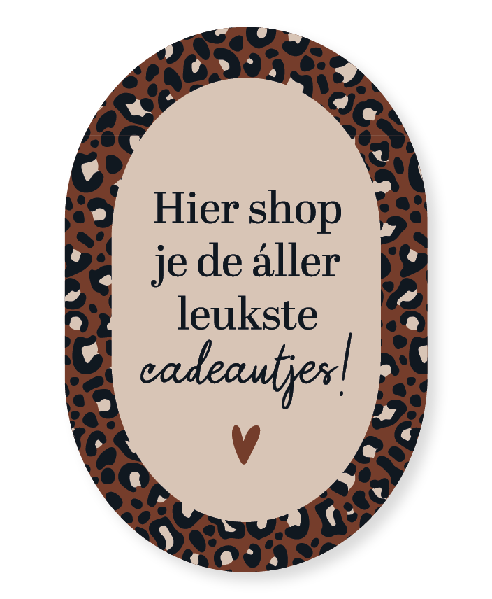 Maak je ramen extra opvallend met deze ovale raamsticker met een trendy panterprint en een zachte achtergrond in het midden, waar de tekst ‘Hier shop je de aller leukste cadeautjes!’ duidelijk straalt. De combinatie van een stoere print en een warme kleur zorgt voor een speelse en uitnodigende uitstraling. Perfect om jouw winkel of interieur een unieke touch te geven! De EasyDot-raamsticker is eenvoudig aan te brengen en herpositioneerbaar. Na gebruik verwijder je hem moeiteloos zonder lijmresten achter te laten.