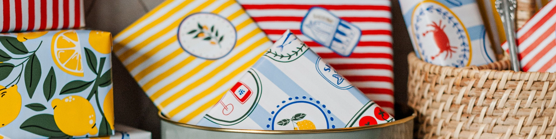 Coated cadeaupapier Seaside Supper op rol van 100 meter met een stijlvol en eigentijds dessin. Perfect te gebruiken voor het inpakken van je cadeautjes of geschenk.