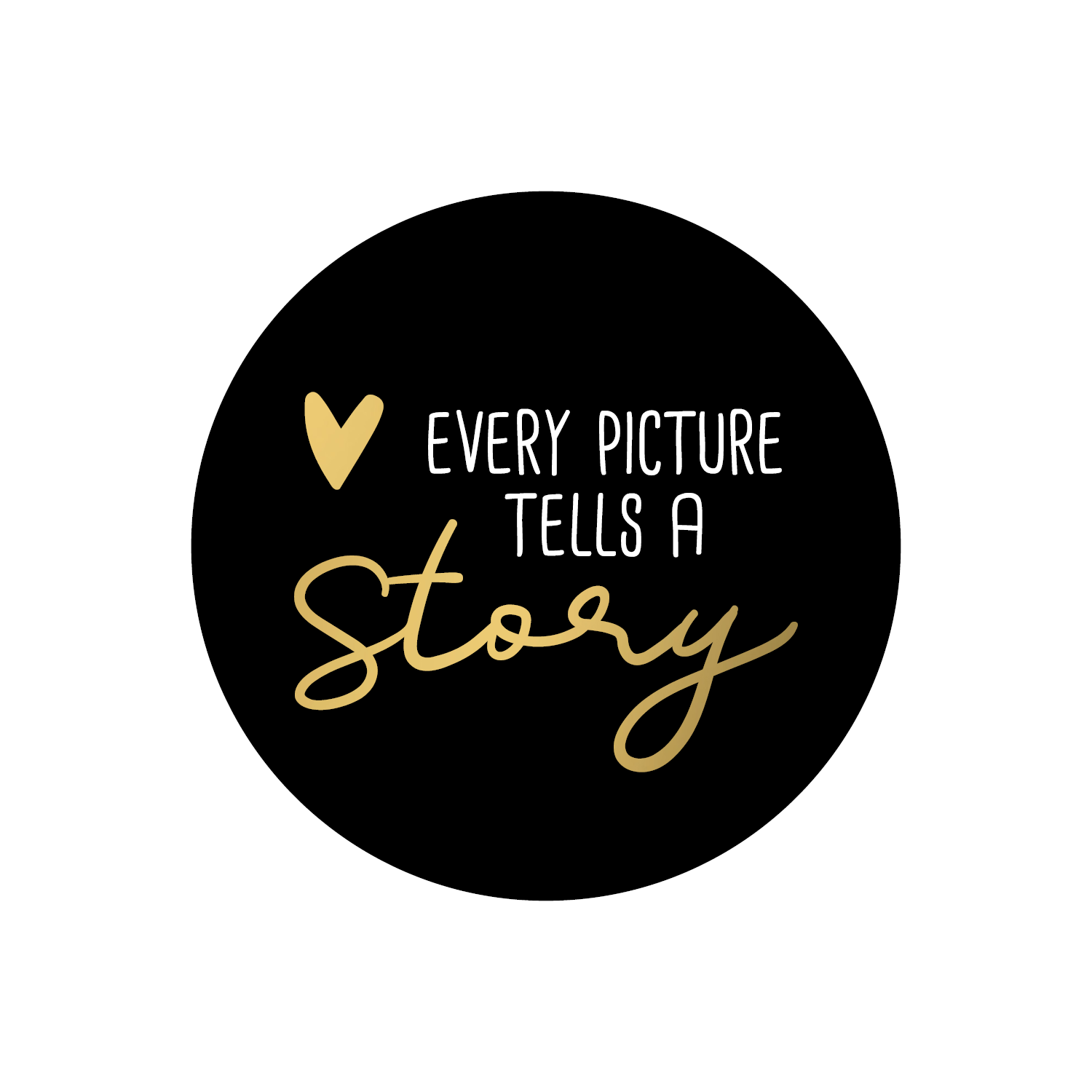 Stickers / Wensetiket / folie etiket rond met opdruk “Every picture tells a story”. Te gebruiken bij verzending van de bestelling of bij uw geschenk.