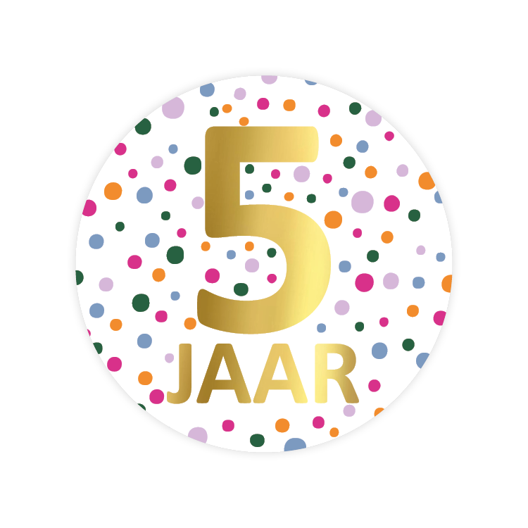 Nieuwe creatie cadeaustickers / sluitstickers! Wensetiket D50mm met opdruk "5 jaar + confetti feest". Te gebruiken bij verzending van de bestelling of bij uw geschenk.