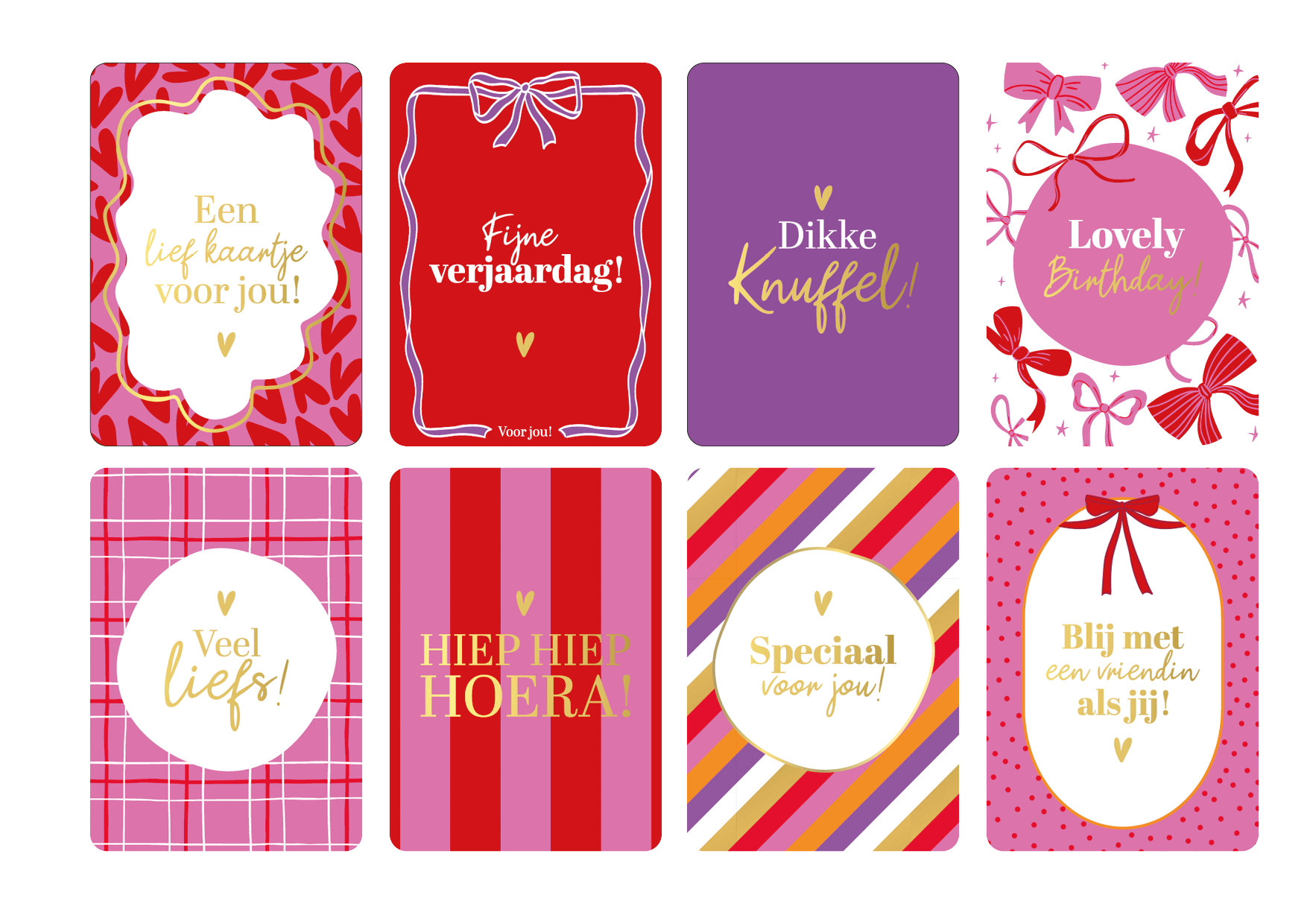 In dit pakket met 24 verschillende dessins ontvangt u van elk dessin 10 kaarten. De volgende wenskaarten zitten in dit pakket: