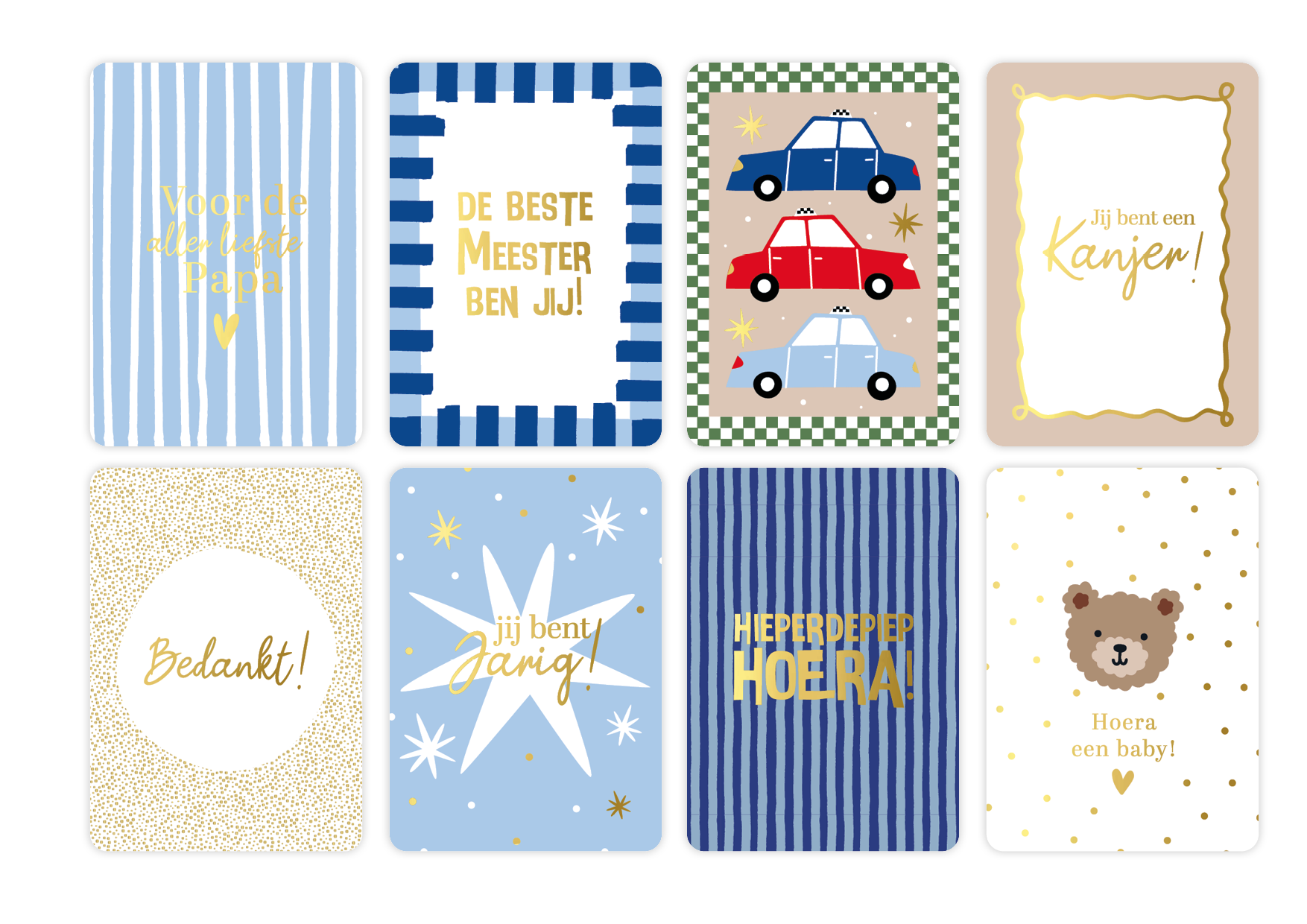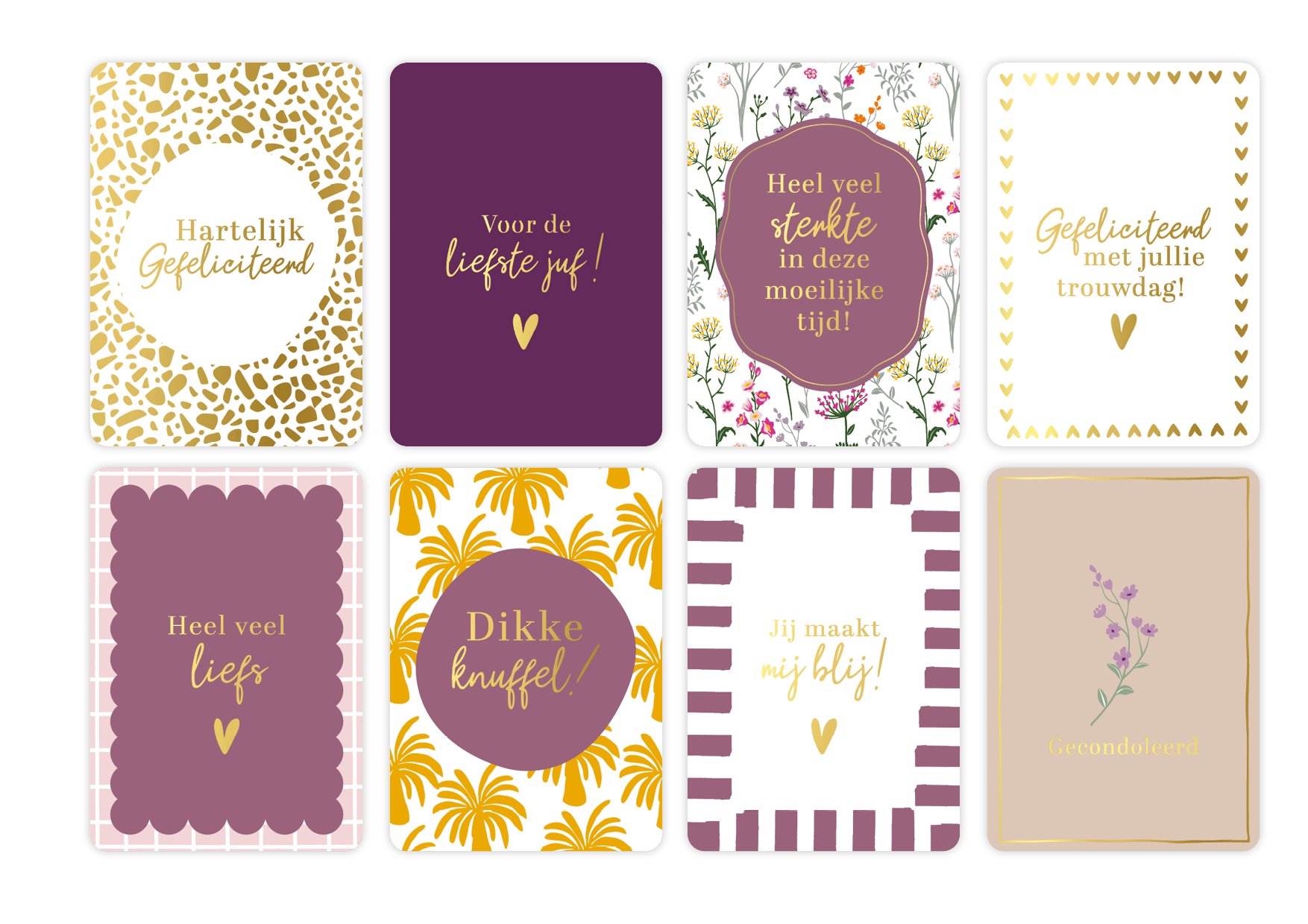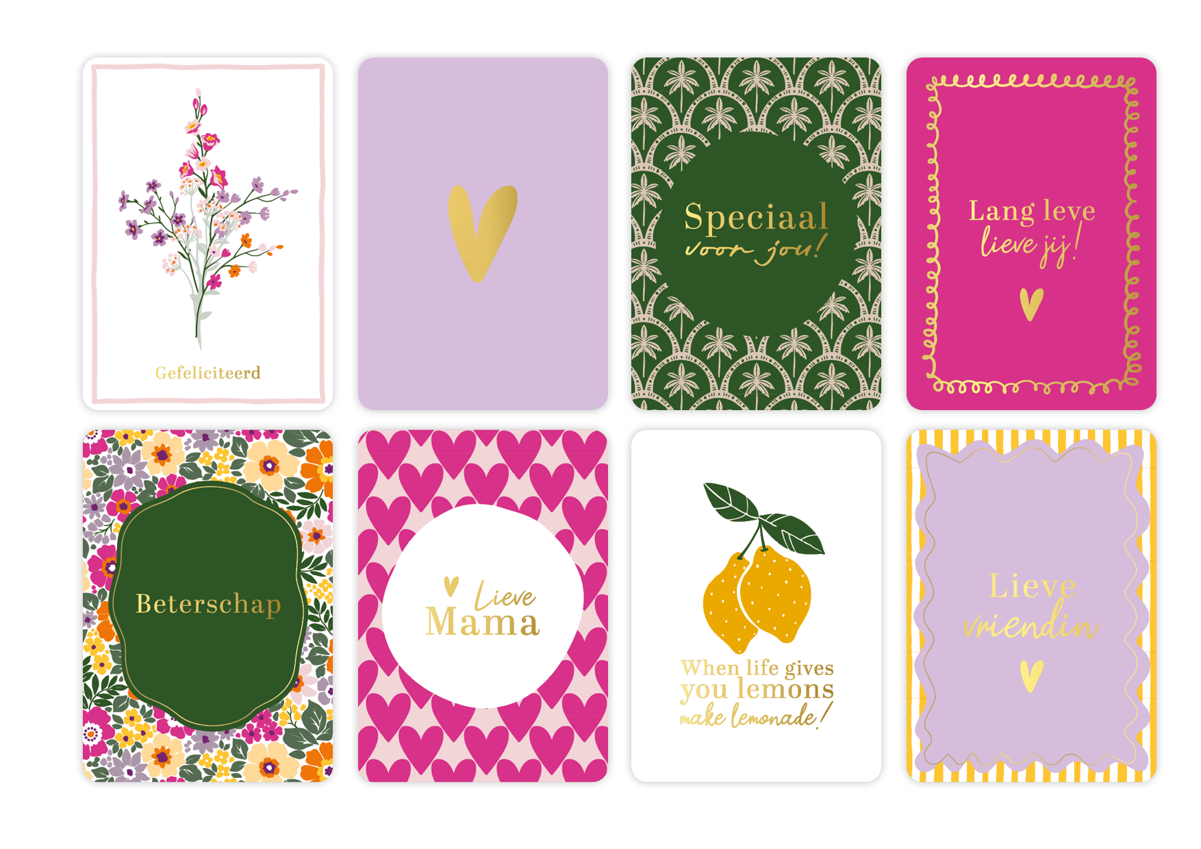 In dit pakket met 24 verschillende dessins ontvangt u van elk dessin 10 kaarten. De volgende wenskaarten zitten in dit pakket: